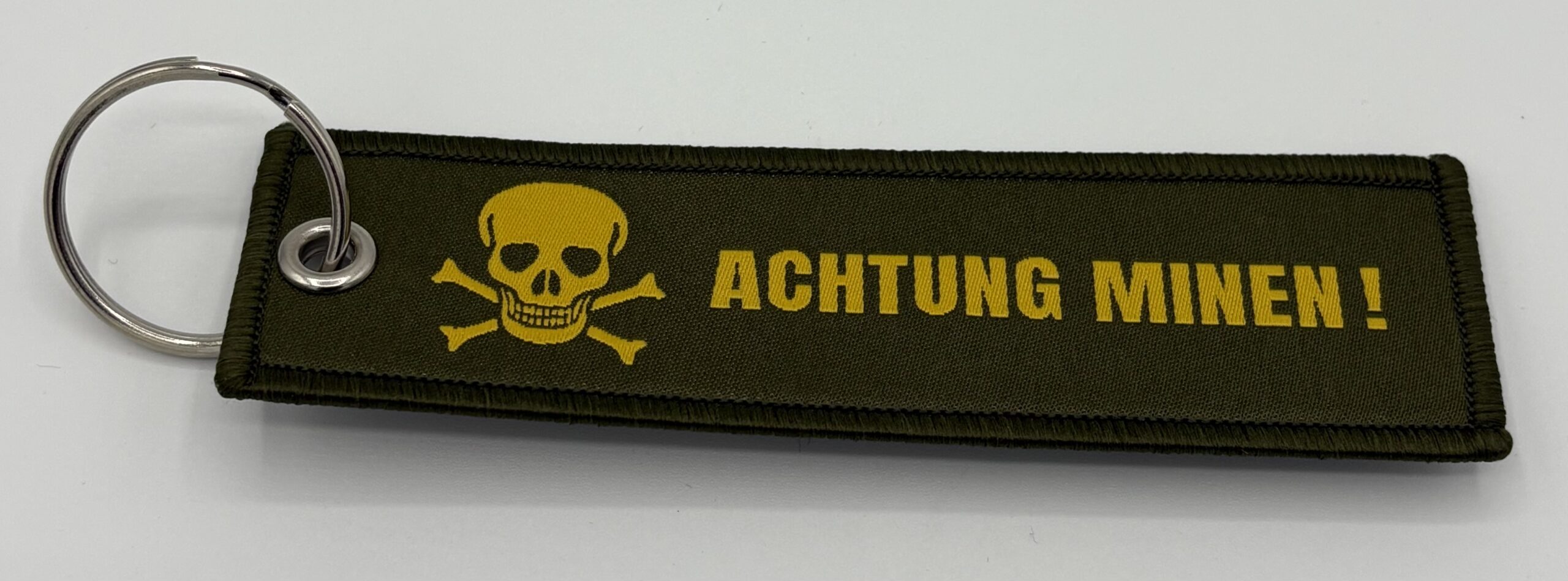 Porte-clés en tissu d’un côté brodé “Achtung Minen” avec sa tête de mort et de l’autre brodé avec la silhouette du canon de la Batterie Todt.